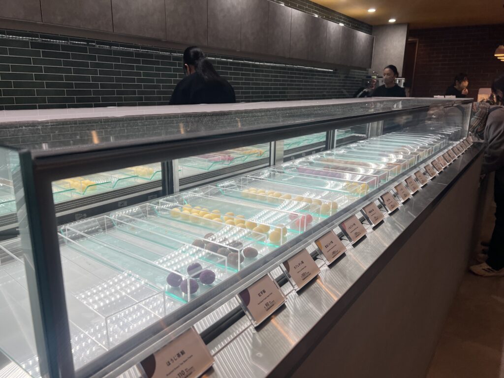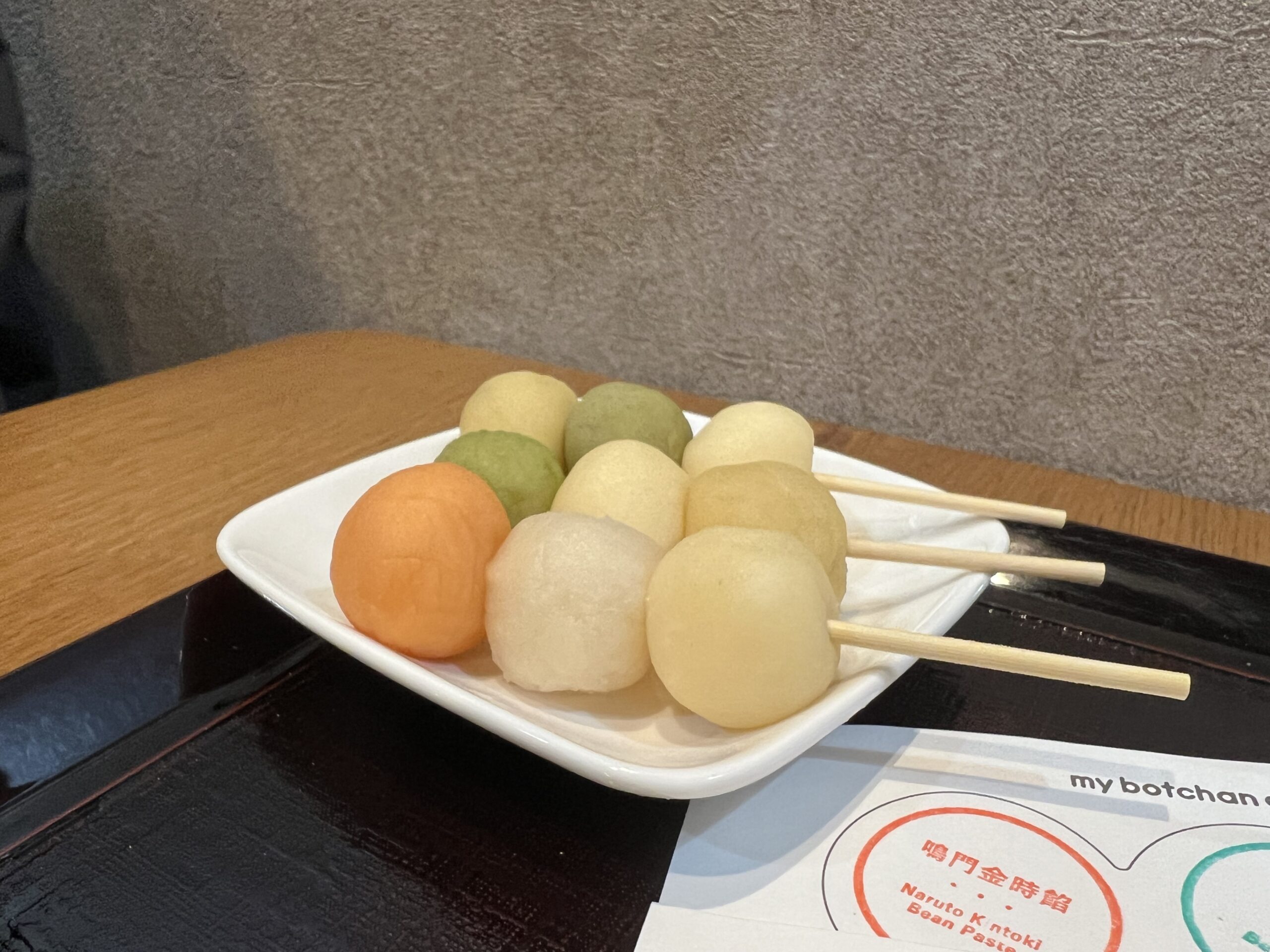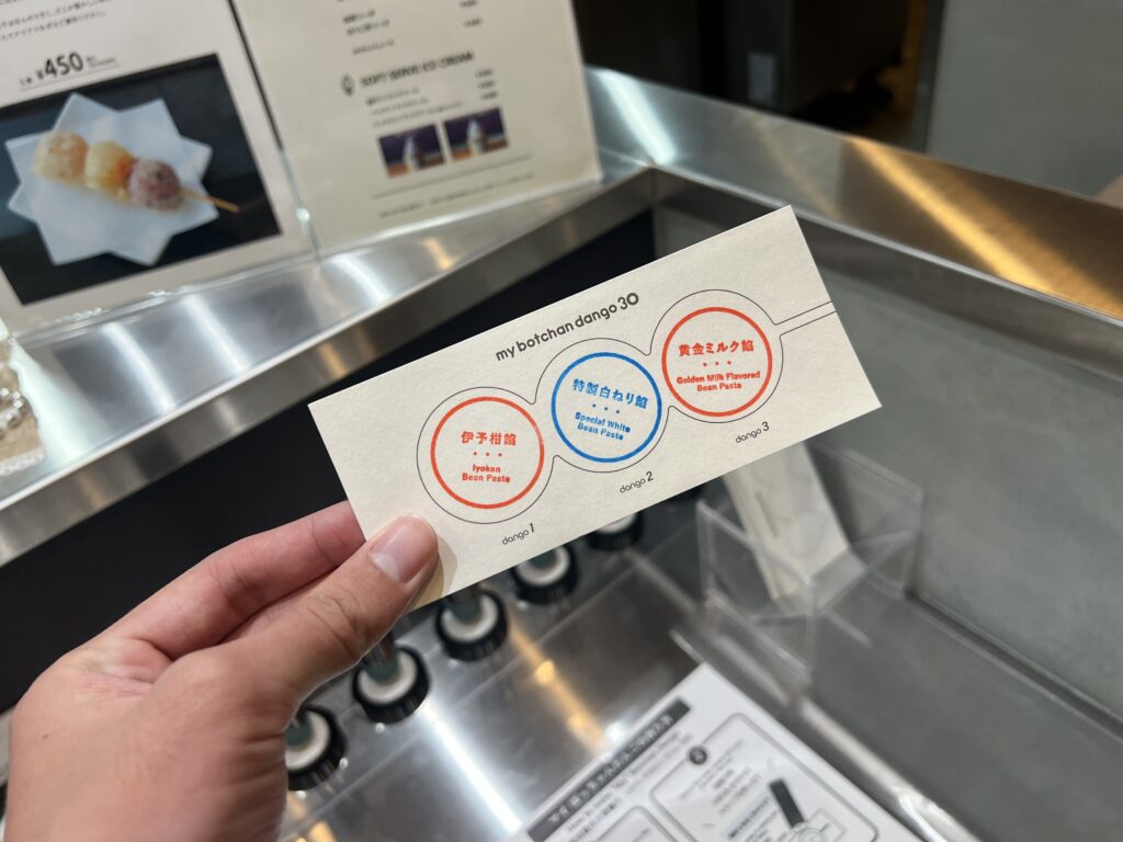 - ショーケースから好きな団子を3つ選ぶ