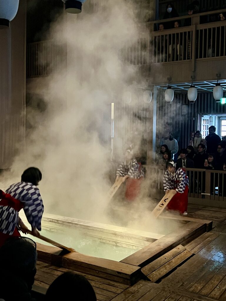 舞台では、湯もみ唄に合わせて木の板で湯をかき混ぜる伝統的な「湯もみ」が披露され、