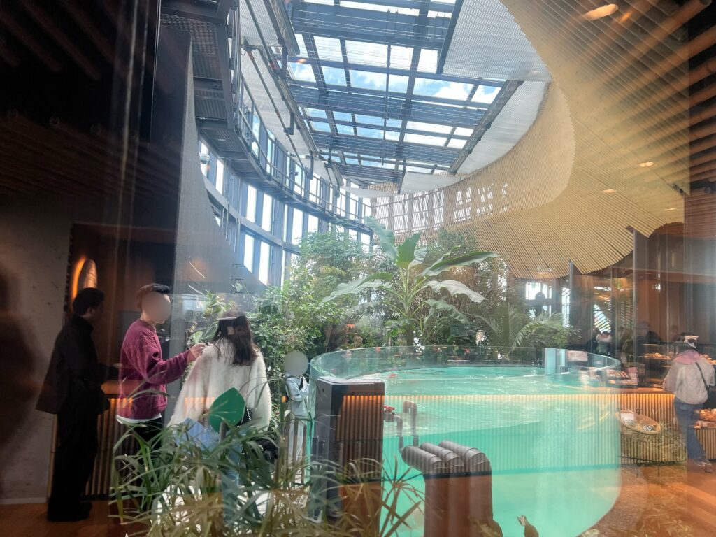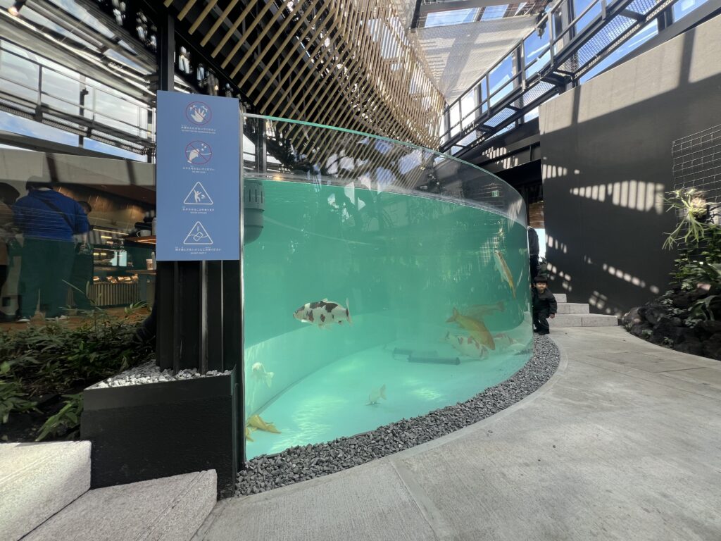 中に入ってまず驚いたのが、まるで植物園のような空間が広がっていること。緑に囲まれた空間の中央には、なんと鯉が泳ぐ水槽まであります。カフェというより、もはや体験型の施設です。