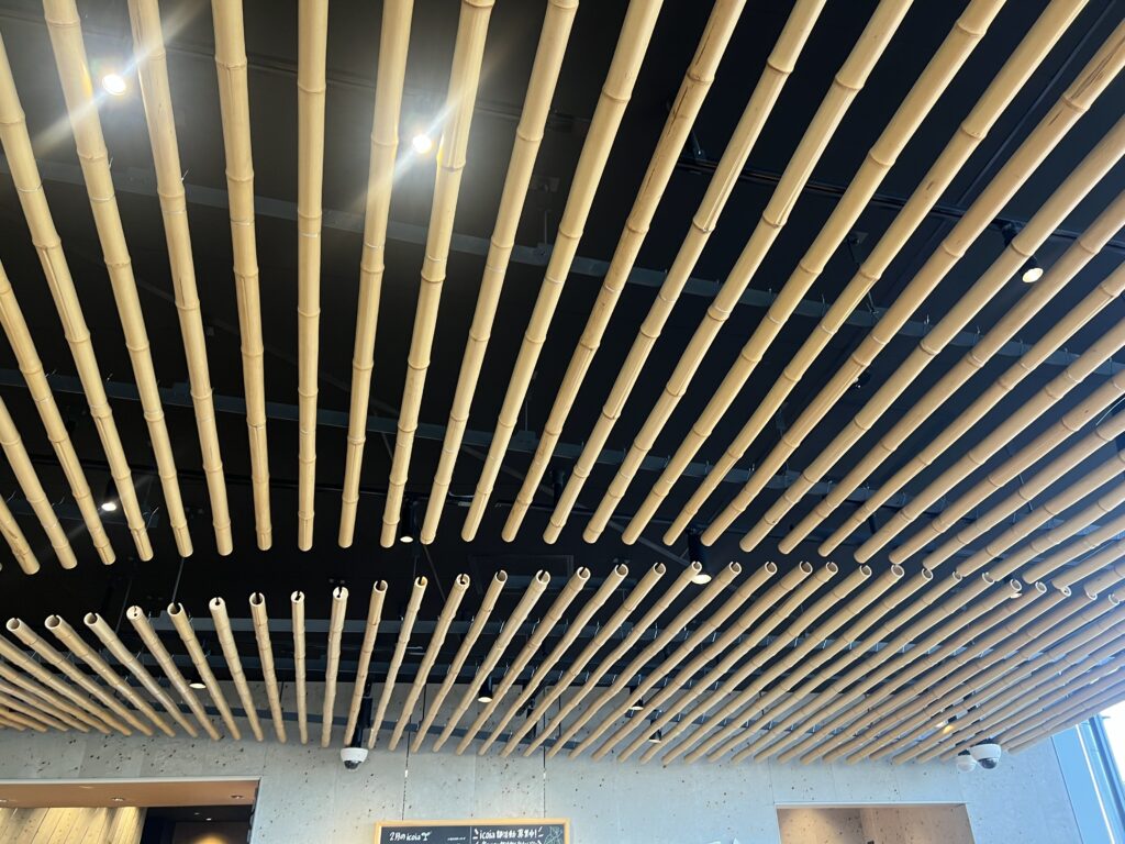 天井を見上げると、竹を使ったような意匠が施されていて、自然素材と現代建築が見事に融合しています。