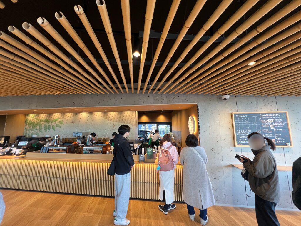 曲線を描く建物と竹を思わせるデザインがとにかく芸術的で、「ここ本当にスタバ?」と思わず立ち止まってしまうほど。建物の外まで行列ができていて、人気ぶりは想像以上でした。